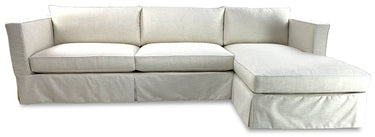 This slipcovered sofa features a shelter arm style with two over two seating and knife edge back cushions for a crisp, tailored profile.
