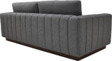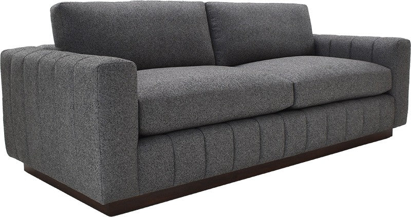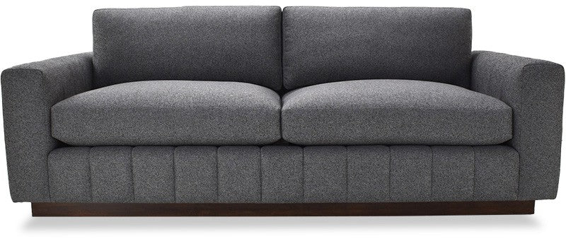 The Kirk Sofa combines modern strength with refined detailing, featuring a channeled upholstered base, broad track arms, and oversized cushions that deliver both comfort and presence. A low wood platform grounds the design, giving it an architectural edge.